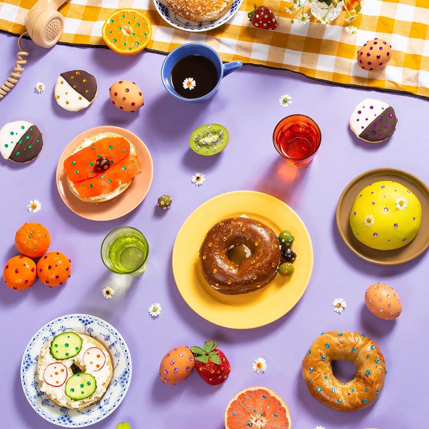 Dive into a dazzling brunch scene full of sparkly strawberries, bedazzled bagels, and rhinestoned olives—because breakfast should always shine!